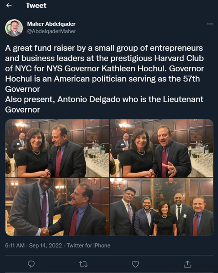 Governor Kathy Hochul took several pictures with Maher Abdelqader, a Democrat donor with a history of sharing anti-Semitic content online, including propagating the conspiracy that six million Jews were not killed in the Holocaust. Hochul, the Democrat governor running for re-election in the Empire State, was attending a Harvard Club fundraiser in New York City last month where she stopped to take a few photos with Abdelqader. Abdelqader twitter post supporting the Governor was deleted after the Governor’s office was asked to comment on the relationship between the two. Will Reinert, spokesperson for the Republican Governors Association, told Fox News Digital, “Kathy Hochul unabashedly rubbed shoulders with a widely publicized radical anti-Semite — begging the question — who else in the Governor’s inner circle have anti-Semitic ties?” Reinert continued, “With friends like these, it’s no wonder recent polling shows Hochul on the ropes and Zeldin surging towards victory.”