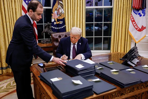 President Donald J. Trump signs 26 executive orders in his first week in office, the highest number ever recorded for any president and surpassing Franklin D. Roosevelt’s previous mark of 15. The orders primarily target immigration enforcement (including mass deportations, border wall expansion, and cartel designations), energy independence (withdrawal from the Paris Agreement and new fossil fuel leases), trade protection (25 percent tariffs on Canada and Mexico, ten percent on China), and the elimination of DEI programs across federal agencies and the military.
