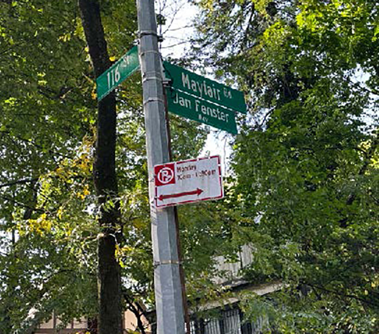 Jan Fenster passed away on February 19, 2023, at the age of 77, and was laid to rest the next day at New Montefiore Cemetery. Her loss was deeply felt across the borough. Soon afterward, the New York City Council approved the legislation to co-name 116th Street and Mayfair Road in her honor. Her name is now permanently recorded in the NYC City Record and Urban Archive’s Queens Name Explorer, ensuring her story will endure long after this generation. In a meaningful final tribute, a replica of the new street sign will be presented to Jan’s siblings, creating a lasting keepsake of the honor bestowed upon their beloved sister.