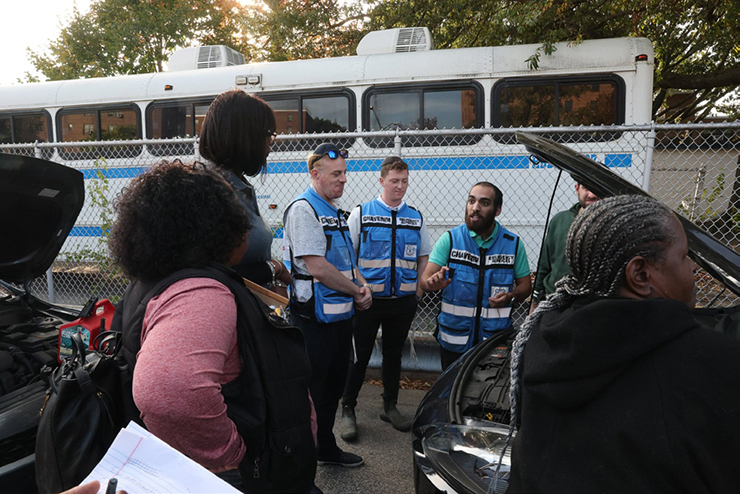 Chaverim has operated as an all-volunteer roadside assistance organization in Queens since 2008, with nearly 130 active responders helping stranded drivers at no cost. Their focus that afternoon was straightforward: showing residents how to address common roadside issues calmly and effectively. Attendees rotated through live demonstrations on changing a tire, plugging a puncture, jump-starting a dead vehicle, checking fluids, and preparing emergency kits. Questions flowed naturally, and so did follow-up demonstrations. Many participants filmed short clips on their phones or scribbled notes for future reference.