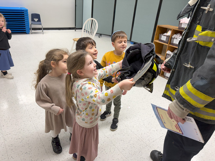 Later, while learning about fire safety in connection with lighting the Chanukah candles, an FDNY firefighter visited the preschool. He showed the children his uniform and explained how each piece helps keep him safe, including his fire helmet. To conclude the visit, each child received a fire safety coloring book and a red plastic fire hat to take home.