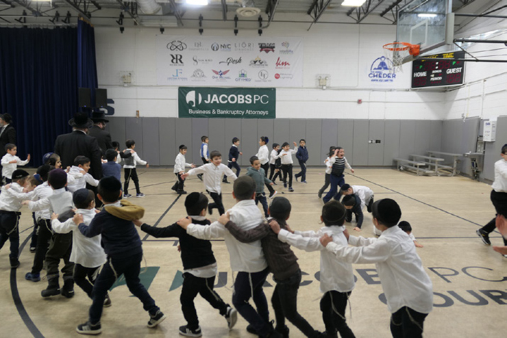 The entire school gathered for a Chanukah chagigah featuring pizza and stories shared by the rebbeim.