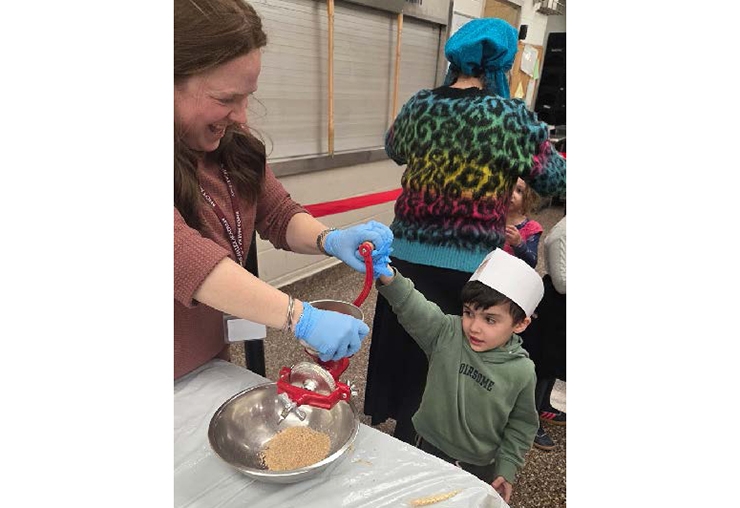 The children began by grinding wheat, gaining an appreciation for the process from grain to flour. They then mixed water and flour to create dough, carefully rolling it out before baking their very own matzos. They even set an 18-minute timer to appreciate how quickly they need to work in a real matzah bakery to make kosher matzos. Each step was presented in a simple, hands-on manner, allowing the students to actively participate and understand the significance of the process.