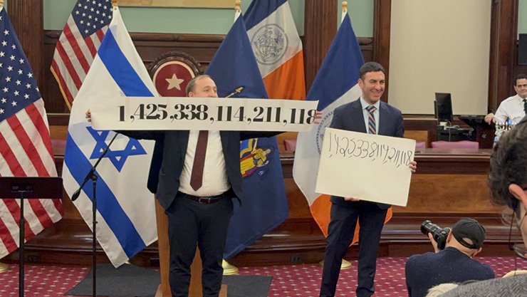 Levinger then performed a live illusion that drew participation from across the room. Council members and audience members – many of whom did not know one another – called out random numbers, which were multiplied together live to form an impossibly large final figure. The illusion culminated in a dramatic reveal: The final number had been predicted in advance, sealed inside an envelope before the program even began. Levinger then decoded the number, revealing how it subtly spelled out “NYC Chanukah.”