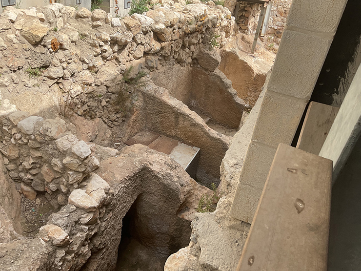 In a room to the north was a hewn square with a drainage ditch attached to it. The altar probably stood on the stone, and the ditch was for draining the blood from the sacrifices. In a room to the north is a small olive press that would have prepared oil for use in the service.