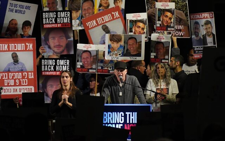 “Your reputation really precedes you,” Rapaport said on a podium to hundreds of Tel Avivians at Hostages Square. “The kindness, the warmth, the generosity that I’ve experienced in my time here has been unparalleled in my travels… I know that everyone here has been affected and everyone is hurting in Israel. I also know that despite what we see on the news, despite what you see on social media, everybody in my city of New York is hurting also. The families that I’ve spoken to, who have sons who are still held captive inside Gaza after having been kidnapped by Hamas terrorists in broad daylight are devastated. The heartbreak and despair that they are enduring is unimaginable and cannot be portrayed by any actor, Jewish or not. Currently there are [still] men, women, and babies who [are] in captivity… They need to come home now!”