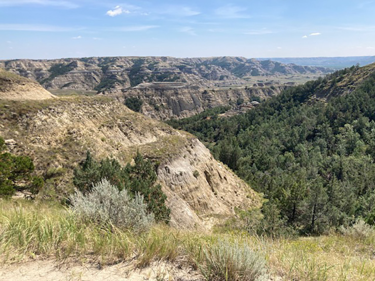The Theodore Roosevelt National Park boasts herds of roaming bison (It’s amazing that they eat a plant-based diet of prairie grass, and yet are so huge). There are also prairie dogs (little gray animals that go up on their hind feet), beautiful fluttering yellow butterflies, tons of grasshoppers, and also wild horses. The prairie grass undulates for miles in graceful waves. The skies are wide over the prairie land. There are also buttes in the park, which are huge rocky hills formed by erosion from the Little Missouri River. The park has many hiking trails bordered by prairie grass, and The Little Missouri River runs through the park. There are warning signs about rattle snakes, as well.