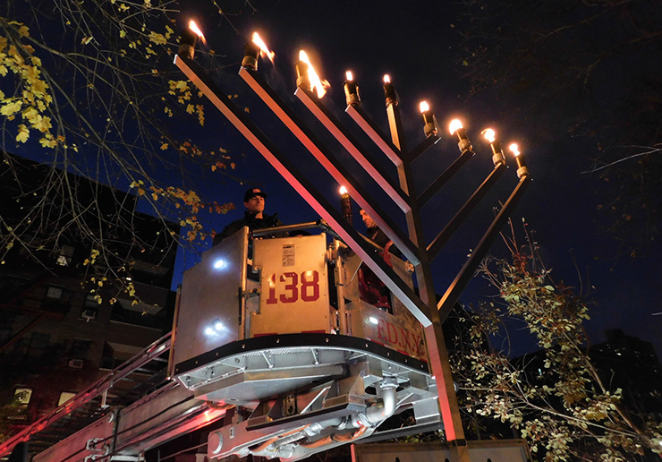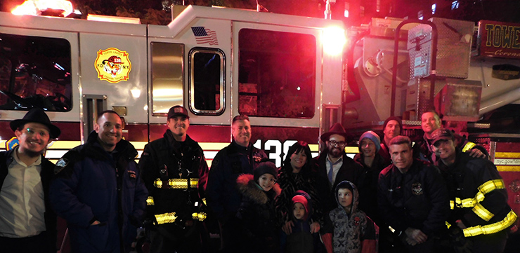 FDNY Ladder 138 from Corona provided the extended ladder so Rabbi Mendy Hecht of Chabad of Forest Hills North could light all eight oil lamps. Before lighting, Rabbi Hecht gave a d’var Torah.