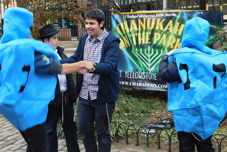 Chanukah ended with a big celebration outdoors in Forest Hills. Bicycle stunts on ramps, a DJ, the lighting of an 18-foot menorah, and hundreds of chocolate coins and mini-parachutes tossed from a 30-foot FDNY Tower Ladder were just part of Chabad of Forest Hills North’s Seventh Annual “Chanukah on the Park,” which took place on Sunday, December 5. Hundreds attended, many of them children.