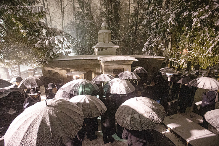 Amid falling snow and freezing winds, HaRav Uziel Leibowitz, shlit”a, Rosh Mesivta Birchas Shmuel, and great-grandson of Rav Boruch Ber zt”l, spoke passionately about Rav Boruch Ber’s impact on the oilam hayeshivos, evoking the koach and opportunity those gathered had to be mispallel at the kever.