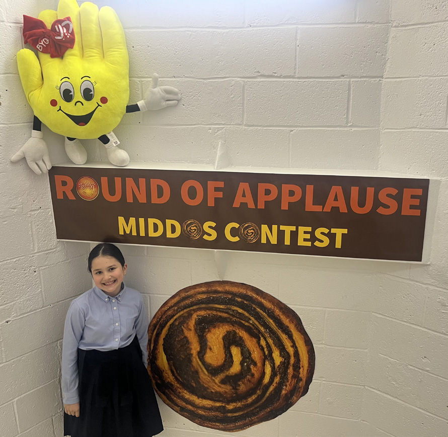 Following the performance, Mrs. Elisa Taub, midos program coordinator, introduced this year’s midos journal contest for grades 3-8. The contest is called the Round Of Applause contest. This connects to our “Hand” theme of the year. Each midah cycle, the two classes that win the raffle will receive a “round” swirly Danish celebration! She then introduced the midah of the week and the important points to work on. There was a tremendous feeling of ruach and achdus as the girls joined along in the already familiar weekly announcement.