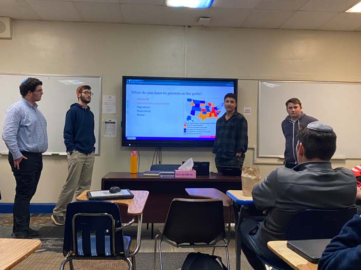Yeshiva University High School for Boys seniors recently showcased their research and public speaking skills in their US Government and Politics course with their “Power of the People: The Vote!” projects. Working in teams, students researched and presented both sides of pressing voting-related questions, including: “Should voting be mandatory?” “Should felons lose their right to vote?” and “Should photo IDs be required for voting?” Following their presentations, students facilitated engaging class discussions, encouraging critical thinking and debate on these important issues.