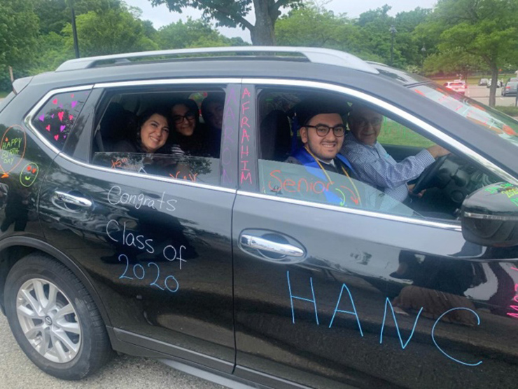 At the conclusion of the ceremony, followed by the blooper reel, faculty lined the “parade route” in a socially distant way, waving to the graduates as they drove through in their decorated cars. This, of course, was a way of carrying on the wonderful, long-standing tradition at HANC, greeting the graduates as they came off the stage. At the end of the parade route, each student was handed his/her diploma by Rabbi Adelman.