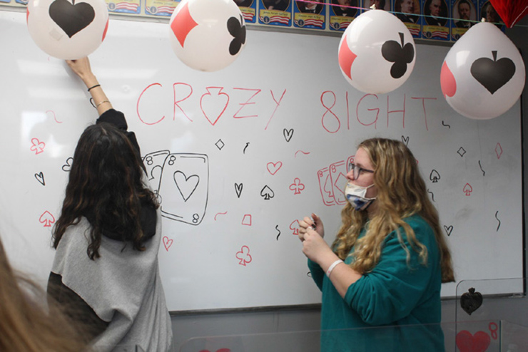 This month, Kislev, the challenge was a little different. Each class needed to stay within their class, as opposed to all gathering together. Each classroom was given a different theme, somehow connected to the number eight, both because of Chanukah (eight nights) and the monthly game (Crazy Eights). One room was traffic signs (a stop sign has eight sides), another was “It’s a boy” (bris milah is usually on the eighth day) and other similar ideas. Each class was provided with a few related decorations and then encouraged to bring in more of their own to enhance their rooms. The rooms were judged by the school’s administration. Rabbi Diamond’s class, Dalet Boys, won first place, earning them a complimentary breakfast at a later time. Their theme was Barbecue (because hot dog and hamburger buns are often sold in packs of eight… yep) and they went all out, including grills and (toy) barbecue food. In the second place room, Morah Sarah’s room, with the theme of Under the Sea (try to figure this one out on your own) had the best dvar Torah written and delivered by Michelle Simkin.