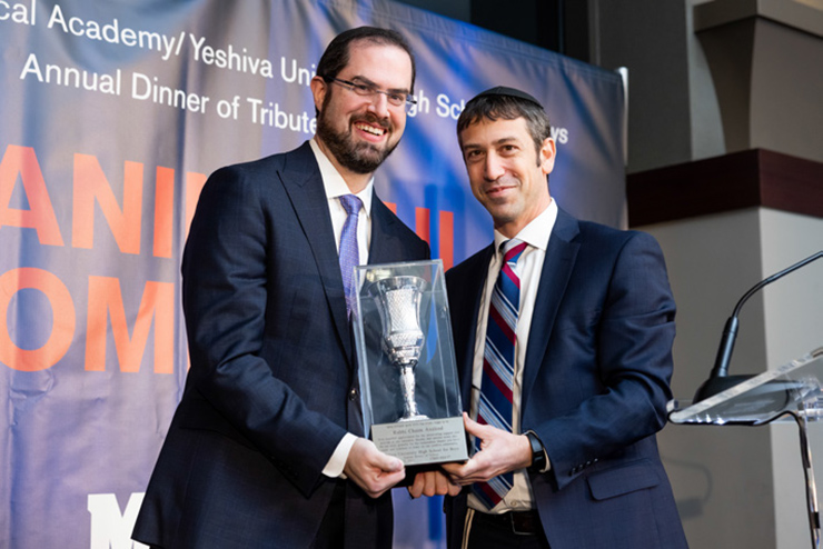 This year’s honorees included Eva (‘90) and Mordy Rothberg, the evening’s Guests of Honor, as well as Dr. Johnathan Halpert (‘62) and his son Rabbi Yehuda Halpert (‘93) as well Aryeh (‘17) and Ezra (‘23) Halpert - three generations of the Halpert family who were honored as the Legacy Family. Rabbi Chaim Axelrod was awarded the Faculty Award for his years of dedication to MTA.