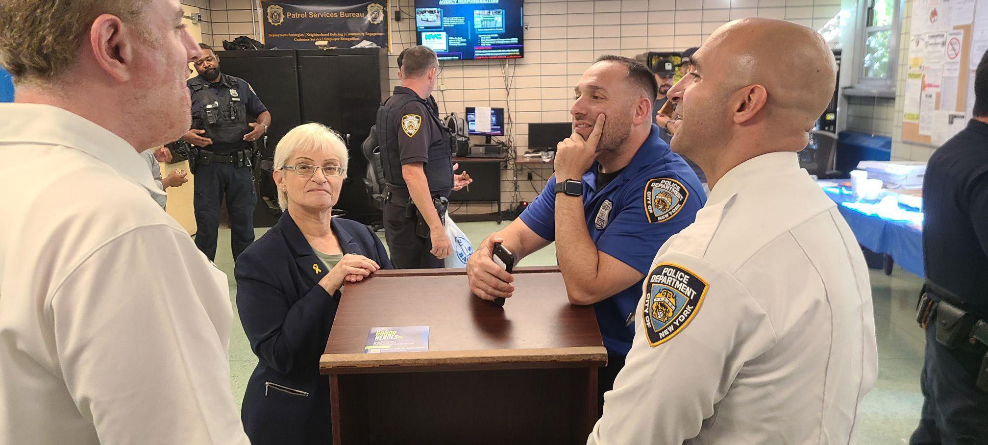 At the conclusion of the 3 p.m. roll call at the 112 Pct., Capt. David Cordano and Community Affairs P.O.s Chris Desantis and Keith Tuohey shared in a discussion of communal safety led by Berger with Council Member Lynn Schulman, and Nesanel Schechter, Patrick Zagdanski, and me for Shmira.