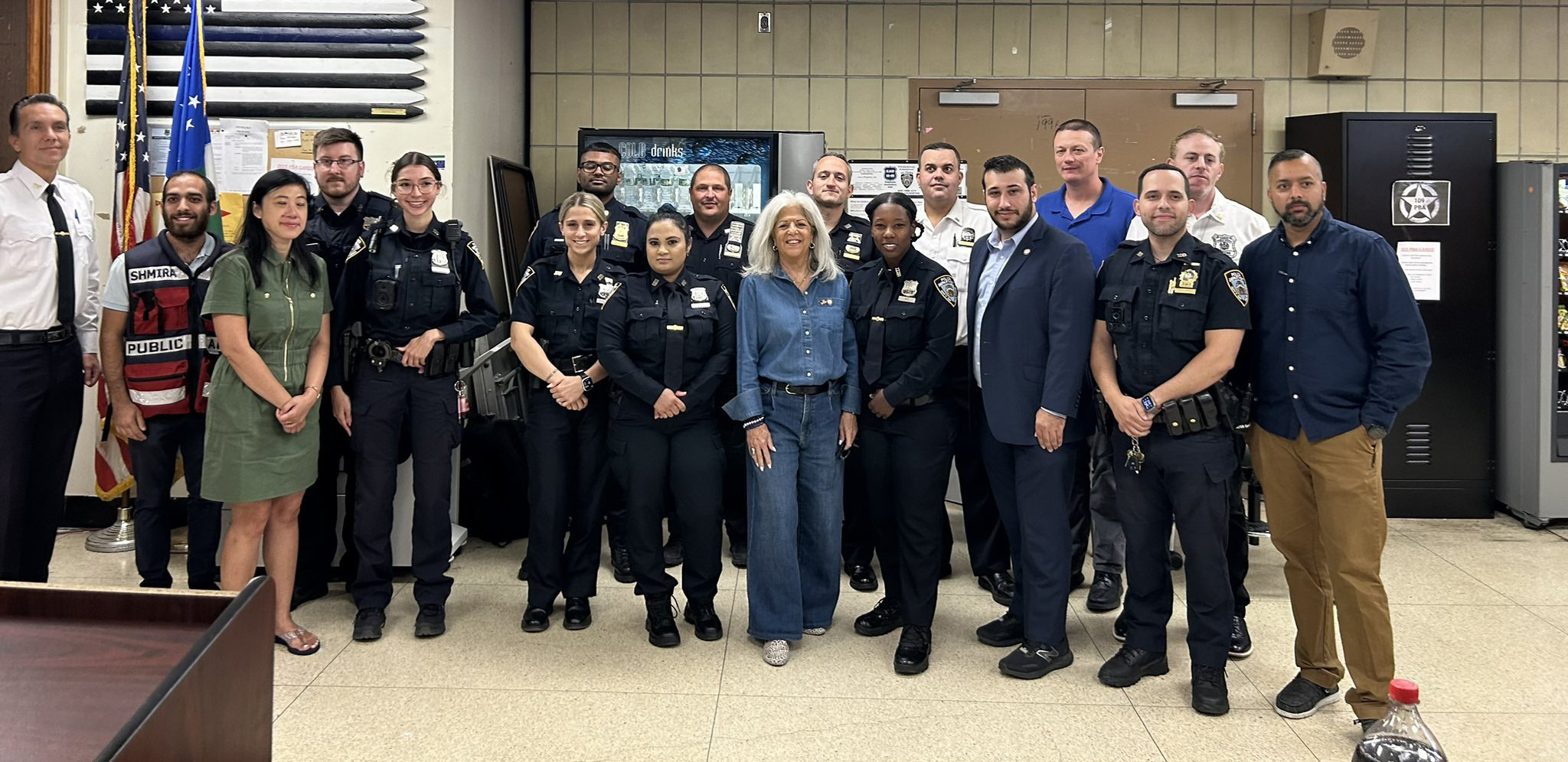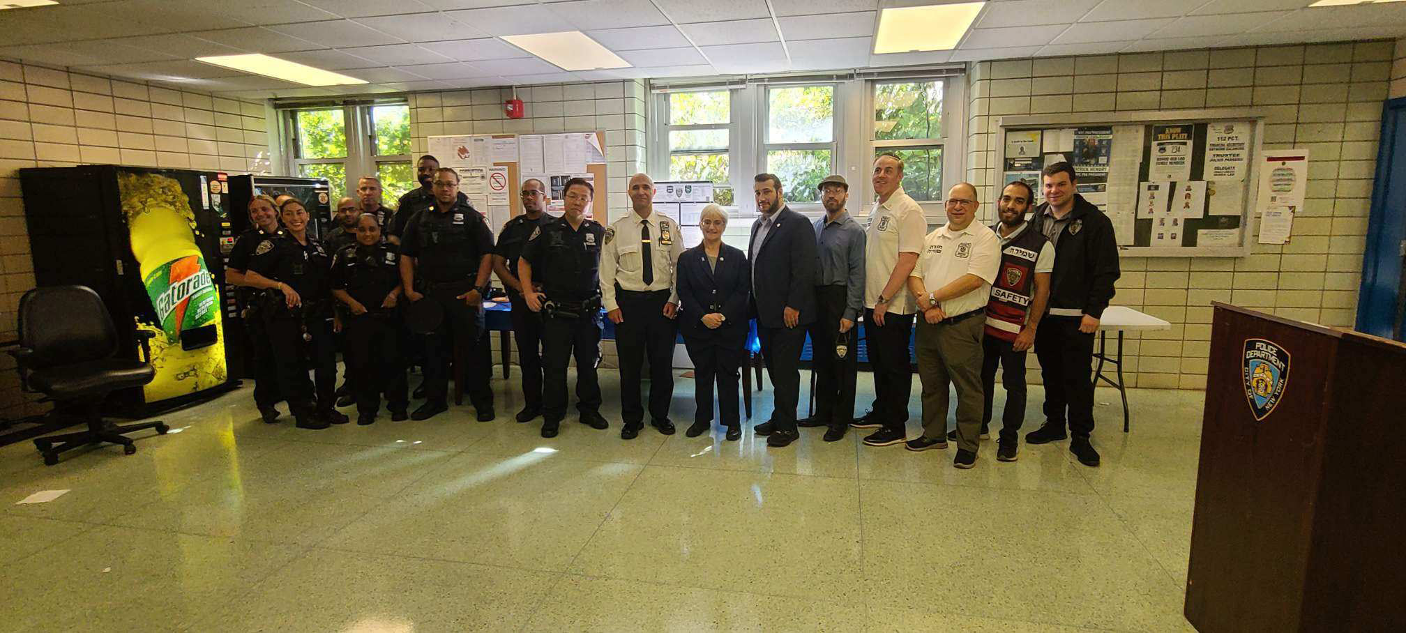 At 11 a.m., Insp. Kevin Coleman, commanding officer of the 109 Pct., welcomed Berger, alongside Council Members Vicky Paladino and Sandra Ung, Elchanan Aronov, and myself on behalf of Shmira. By 12:15 p.m., Community Affairs POs Kevin McCarthy and Tim Gorman gathered 107 Pct. personnel for a presentation with Berger that included the presence of Council Member James F. Gennaro, QJL co-publisher Yaakov Serle, Community Board 8 member Israel Peskowitz, and Shmira Board Member Meshulem Lisker with members and myself.