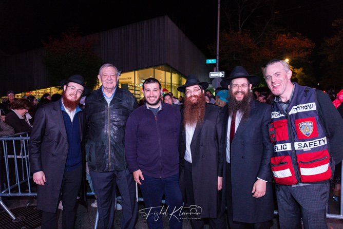 Community rabbonim, including Young Israel of Forest Hill’s Rabbis Elisha Friedman and Zalman Mergui, and leading Queens Jewish personalities, dotted the streets. Local Assemblymember Sam Berger, whose office staff was quite helpful with arranging for the required permits, graced the stage with a powerful message. The elected official noted that one year ago he stood at the same crosswords decrying the heinous Hamas atrocities carried out on Simchas Torah and now with a difficult year in the rearview mirror was able to celebrate in the holiday spirit, as the bulk of those who bore responsibility for the terrorist activities have been eliminated.
