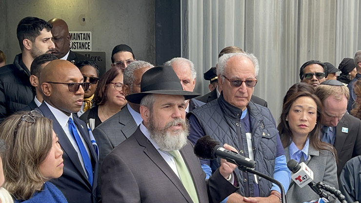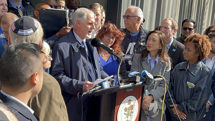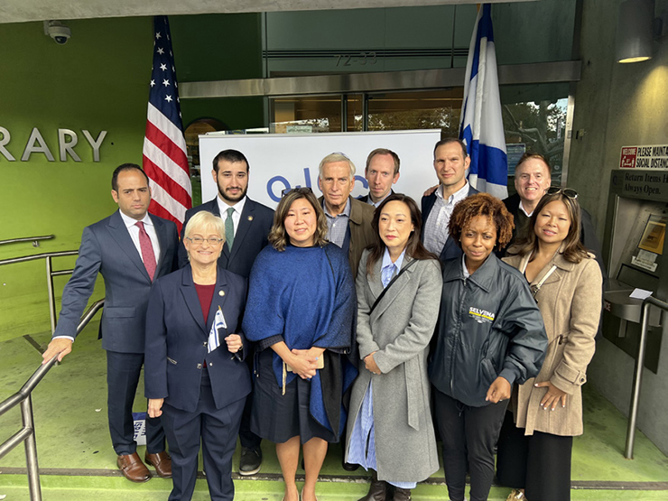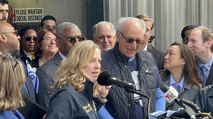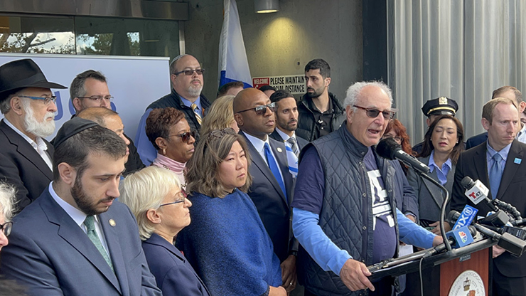 Newly appointed State Assemblymember Samuel Berger, whose parents David and Paula were in the audience, spoke directly to his Israeli family members: “To my family there, fighting now, be safe.” His colleague Nily Rozic, an Israeli national who concluded her remarks in Ivrit, observed, “My family [and] my friends in Israel have been terrorized and traumatized. I have been traumatized. So many of my cousins [and] my family members have been fighting to keep everyone safe.”