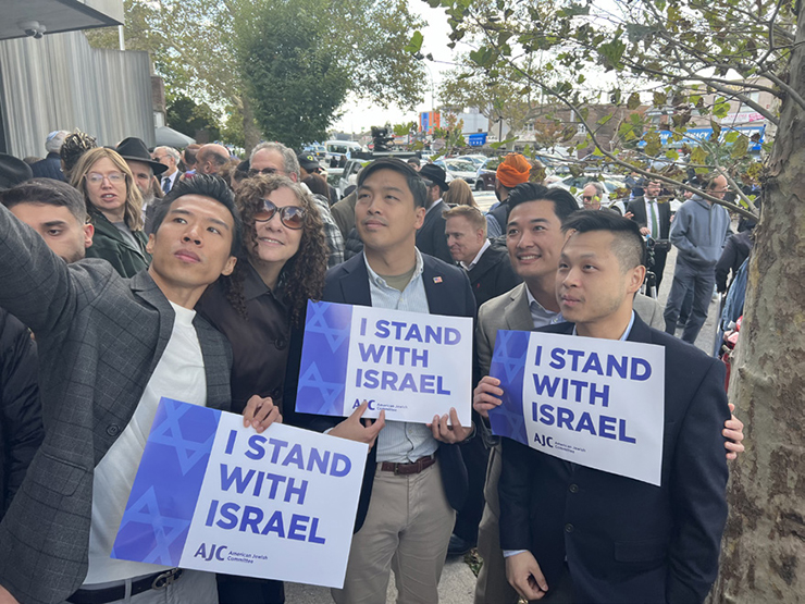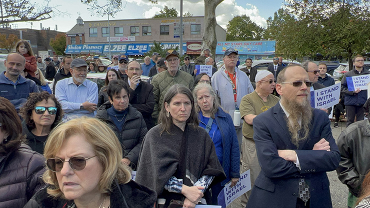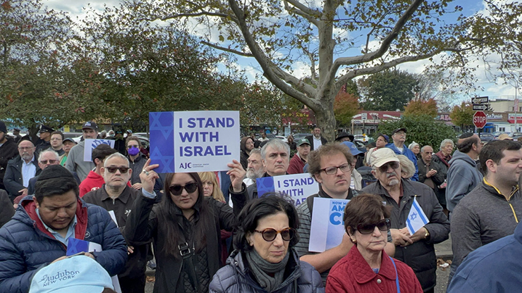 Feelings of anger, grief, and solidarity were shown by the spirits of community residents, who held Israeli flags and “I Stand with Israel” signage provided by the ADL and Shraga Teichman, a QJCC Board Member.