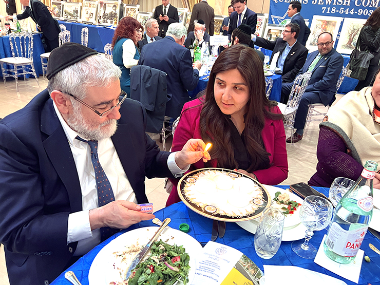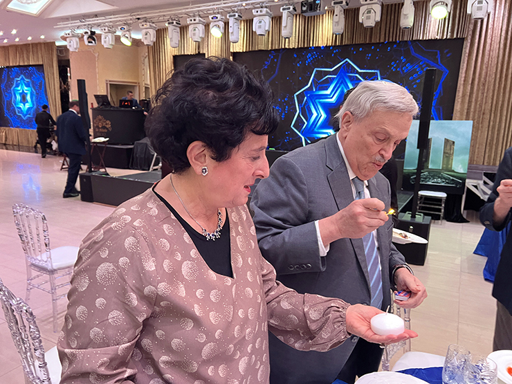 Rabbi Joseph Potasnik, Executive Vice President of the New York Board of Rabbis, recalled how parents of the children killed in a terror attack by a disco erected a monument emblazoned with the words, “We will not stop dancing.” Mike Nussbaum, he said, reminds all of us that “We are not going to stop living and loving as Jews.” He also noted how Nussbaum has always worked for Jews and non-Jews to stand united. Potasnik added, “The Cardinal of New York, His Eminence Timothy Cardinal Dolan, called me from Rome and said, ‘I want you to tell all of your people that this Sunday in every church in the archdiocese a collection will be held for the People of Israel.’” At the conclusion of his remarks, each table passed around memorial candles that were lit in memory of those who lost their lives because they were Jews. It was poignant to watch dignitaries of all colors and creeds embrace the solemnity of the moment as they completed this ritual.
