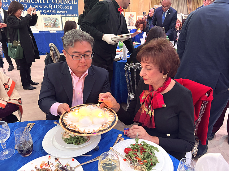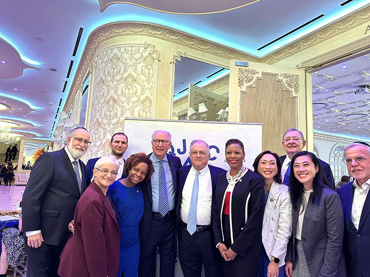 Queens Borough President Donovan Richards, who was set to head to Israel on a JCRC-NY educational mission, evoked the unity of Blacks and Jews during the civil rights movement and took note of recent “unspoken tension, but we stand together; this is a tough time, without a doubt. It is hard to celebrate on an evening like this when we know there are hostages and are reminded of that sheer brutality that all of us saw play out.” In supporting Israel’s right to defend herself, Richards spoke of Jewish resilience dating back to the Holocaust. “Then, we said never again. Well, we’re back here again. And we still will say never ever again.” Richards recognized Vladimir Epstein and Leonard Bard of Chicago, who proposed to Mike Nussbaum, Karen Koslowitz, and Barry Grodenchik amongst others, the idea of a Holocaust Memorial outside of Queens Borough Hall. Richards promised that the memorial, which is set to include reflective benches and the Star of David, is well underway, with appreciation to the Adams administration. The QJCC is organizing private funds for the construction.