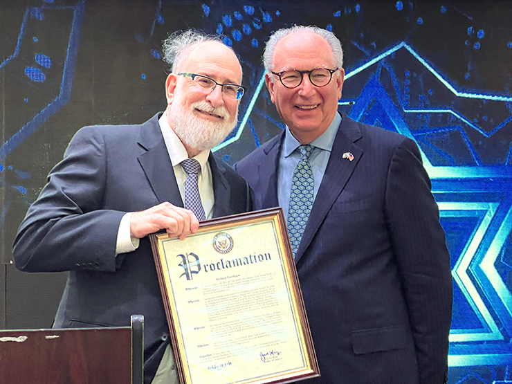 Assemblymember Sam Berger held a proclamation for Nussbaum as Assemblymember David Weprin spoke, calling Nussbaum “a great human being.” They were joined by colleagues Assemblymembers Ed Braunstein and Stacey Pheffer Amato, as well as State Senator John Liu and judicial candidate Evelyn Gong. Rabbi Daniel Pollack, Jewish liaison to Rep. Grace Meng, presented Nussbaum with a similar appreciation. Video addresses were delivered by Senator Charles Schumer, Attorney General Tish James, Reps. Greg Meeks and Meng, and Rabbi Michael Miller, CEO Emeritus of the JCRC-NY.