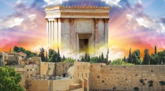 One of those images is of the Beis HaMikdash emerging from behind the Kosel. The magnificent and august facade of the Heichal building – the sanctuary that housed the Menorah, the Shulchan, the inner Mizbei’ach and the Aron – rises from behind the ancient wall in the place where the Dome of the Rock currently is.