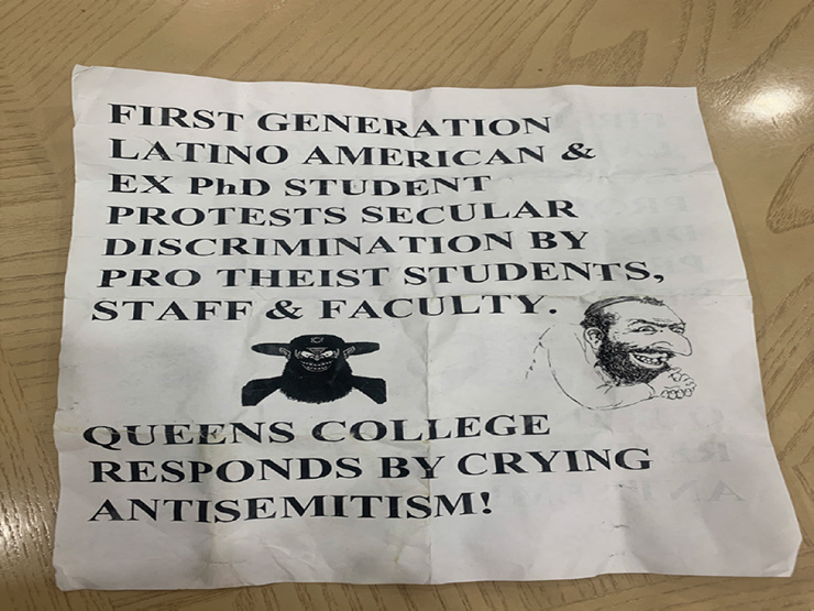 It seems that the anti-Semitic man who was seen screaming into a megaphone recently at Queens College has not received as much attention as he wanted. In an attempt to once again steal the spotlight, our resident neighborhood racist has struck once again, this time taking inspiration from anti-dementors all over the world. Walking out of Queens College, I saw the racist’s masterpiece littering the floor. I could not help but marvel at the effort put into this flyer. It was clear a talented graphic designer spent effort on it.