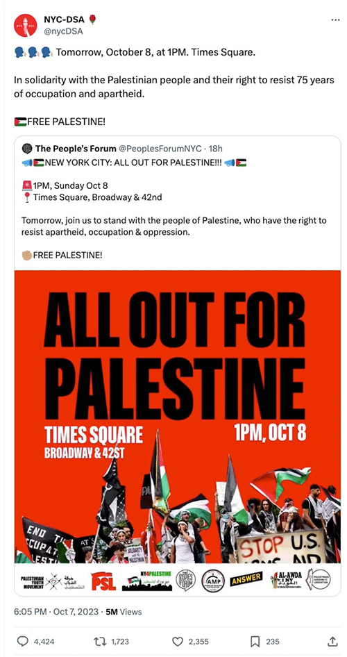 The New York City chapter of the Democratic Socialist of America held a rally on Sunday in support of the terrorists. The rally, titled “All Out For Palestine” is “in solidarity with the Palestinian people and their right to resist 75 years of occupation and apartheid.” They make no effort to hide their intention. They crave Jewish blood. They cheer for the kidnappers and murderers of civilian women and children. This is the DSA.