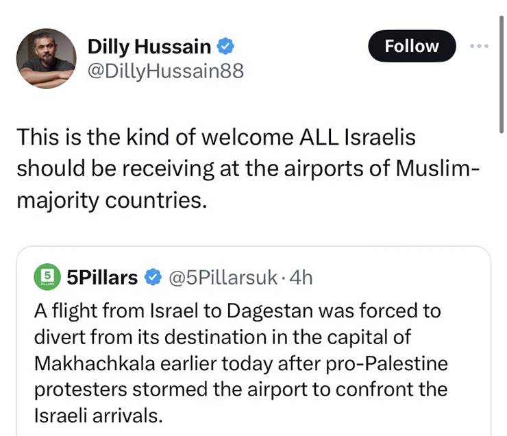 This isn’t limited to Russia by any means. Dilly Hussain, a writer for the Huffington Post UK, reacted to the mobs storming the airport in Dagestan saying, “This is the kind of welcome ALL Israelis should be receiving at the airports of Muslim-majority countries.” This happened on the same weekend where 100,000 gathered in London to demand the end of the Jewish state.