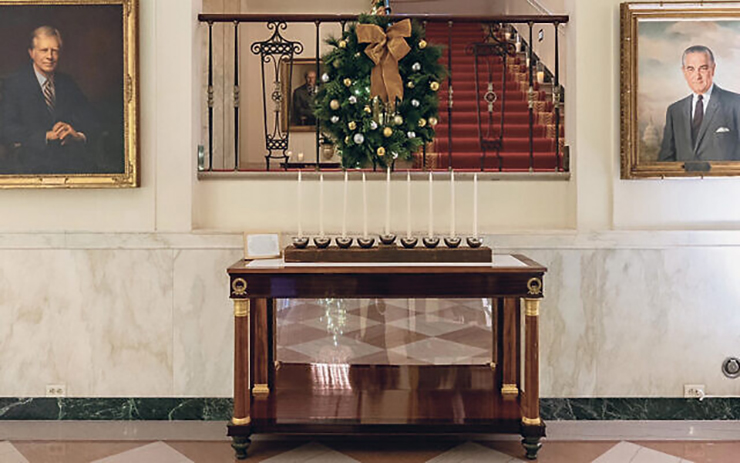 Every year, a different menorah is used at the White House ceremony, an object with historical meaning borrowed from a museum or a family. This year’s menorah is made from a wooden beam that was removed from the White House in a renovation and topped with silver candle holder cups. It is the first menorah that belongs to the White House, intended for future celebrations.