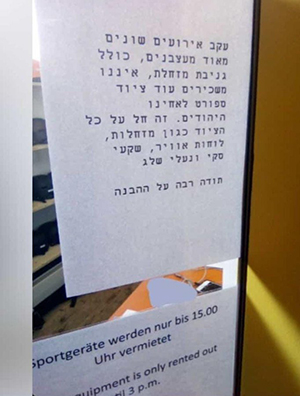Switzerland’s main Jewish organization condemned an anti-Semitic sign at a ski shop near Davos, barring Jews from renting equipment. The sign cited “annoying incidents,” including theft, and appeared directed at Israeli Jews. Police opened an investigation for possible discrimination. The Swiss Federation of Jewish Communities labeled the poster as discriminatory and indicative of rising anti-Semitism. Despite Jewish guests feeling welcome in Davos, there are reported tensions regarding adherence to local rules.