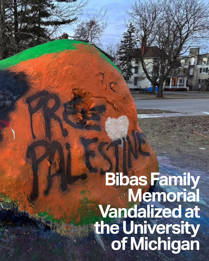 Terror supporters at the University of Michigan vandalized a memorial known as “The Rock,” a large boulder painted orange to honor the Bibas family, including 9-month-old Kfir and 4-year-old Ariel, kidnapped during the October 7, 2023, Hamas attack on Israel. The vandalism included “Free Palestine” graffiti and an inverted red triangle, a symbol used in Hamas propaganda to mark targets. The memorial also commemorated Shiri Bibas, the boys’ mother, killed along with her children while in captivity in Gaza. The defacement occurred days after the rock was painted, prompting outrage from Students Supporting Israel in Michigan, who called it morally depraved. The university has not reported arrests related to this incident, though antisemitic vandalism has been recurrent on campus.