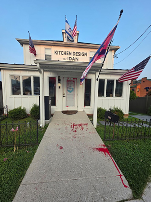 Kitchen Design by Idan, a Jewish- and Israeli-owned business in Baltimore County, was vandalized when a man threw red paint across its entrance, defacing Israeli and American flags. Surveillance footage captured the incident, which occurred late Wednesday night. Baltimore County Police are investigating it as a potential hate crime, following condemnation from community leaders who labeled it antisemitic. No arrests have been made, and the investigation remains active.