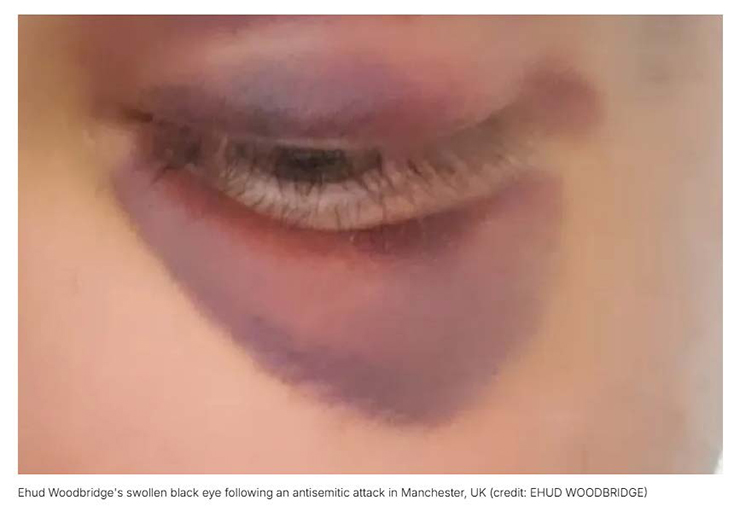 Ehud Woodbridge, a Jewish man in Manchester, UK, was spat on and punched in the eye during a discussion about Israeli politics, as reported to the Jerusalem Post. The assailant, who fled after Woodbridge defended himself, was not reported to police due to Woodbridge’s belief that authorities would not act. He described the attack as part of a broader surge in antisemitism across the UK.