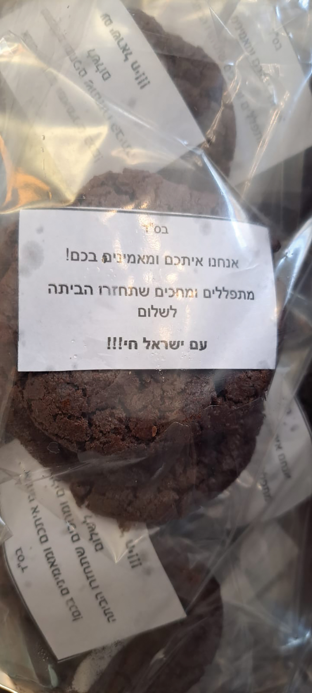 When we visited our son’s base, the chayalim were amazed by the effort put into the food that our neighbors had sent. In one package, each cookie had been individually wrapped in its own bag along with an encouraging note. My son’s base is treated to a barbecue or pizza almost every night.